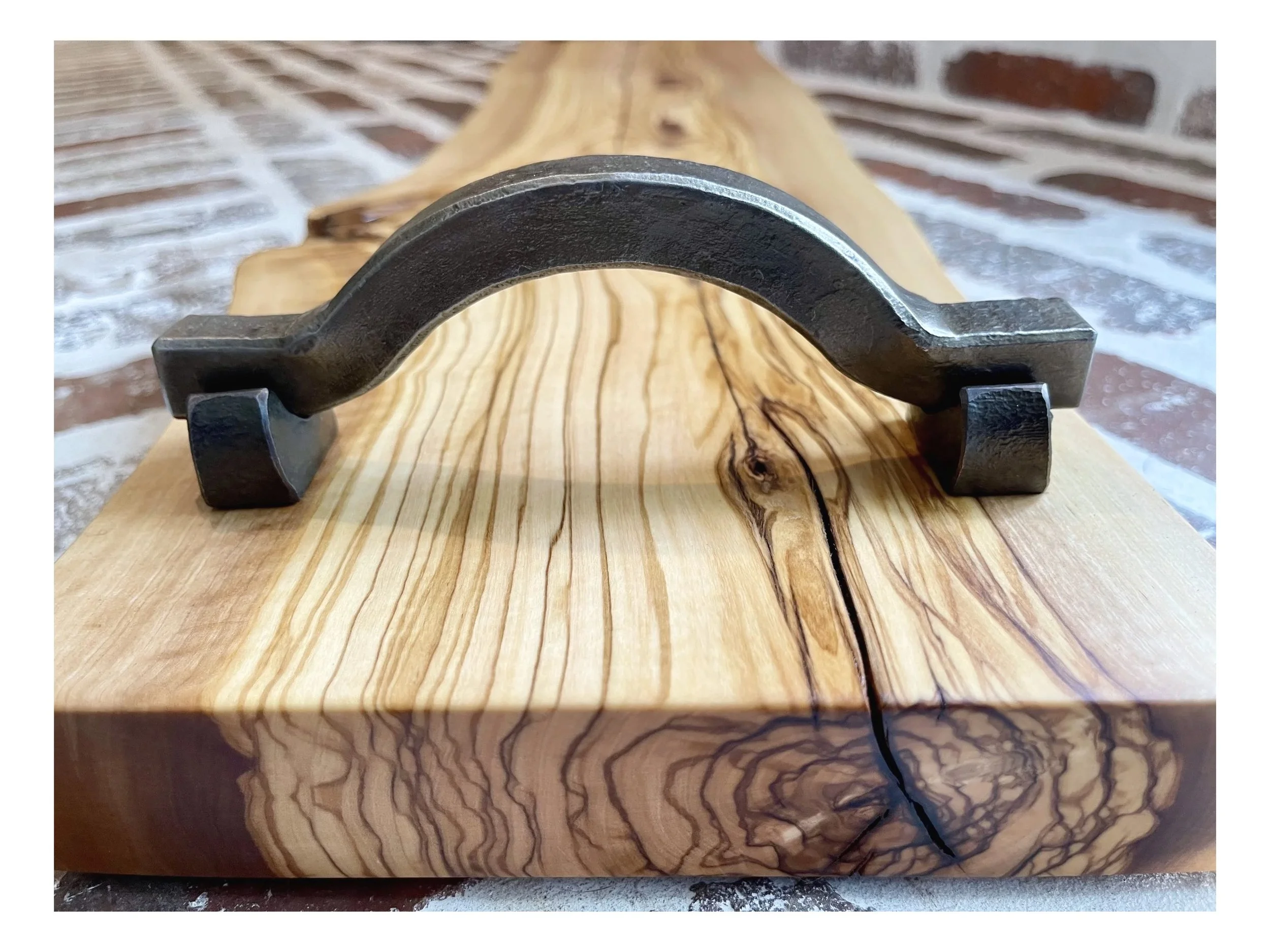 charcuterie platter in live edge olive wood with forged handles